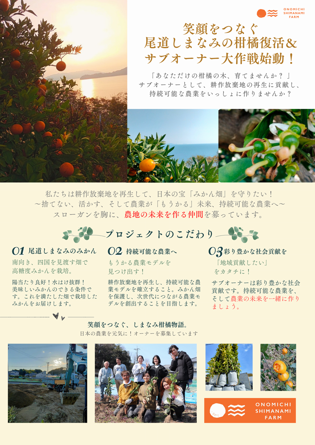 尾道市向島をオレンジの島にしたい。そのために廃棄物である柑橘皮から精油を製造する新たなサプライチェーンを創造します。これは東京の会社と連携し実現いたします。さらに、柑橘栽培も本格的に行っていきます。2025年3月に250本ほど植付ました。今後も少しずつ増やしていきます。